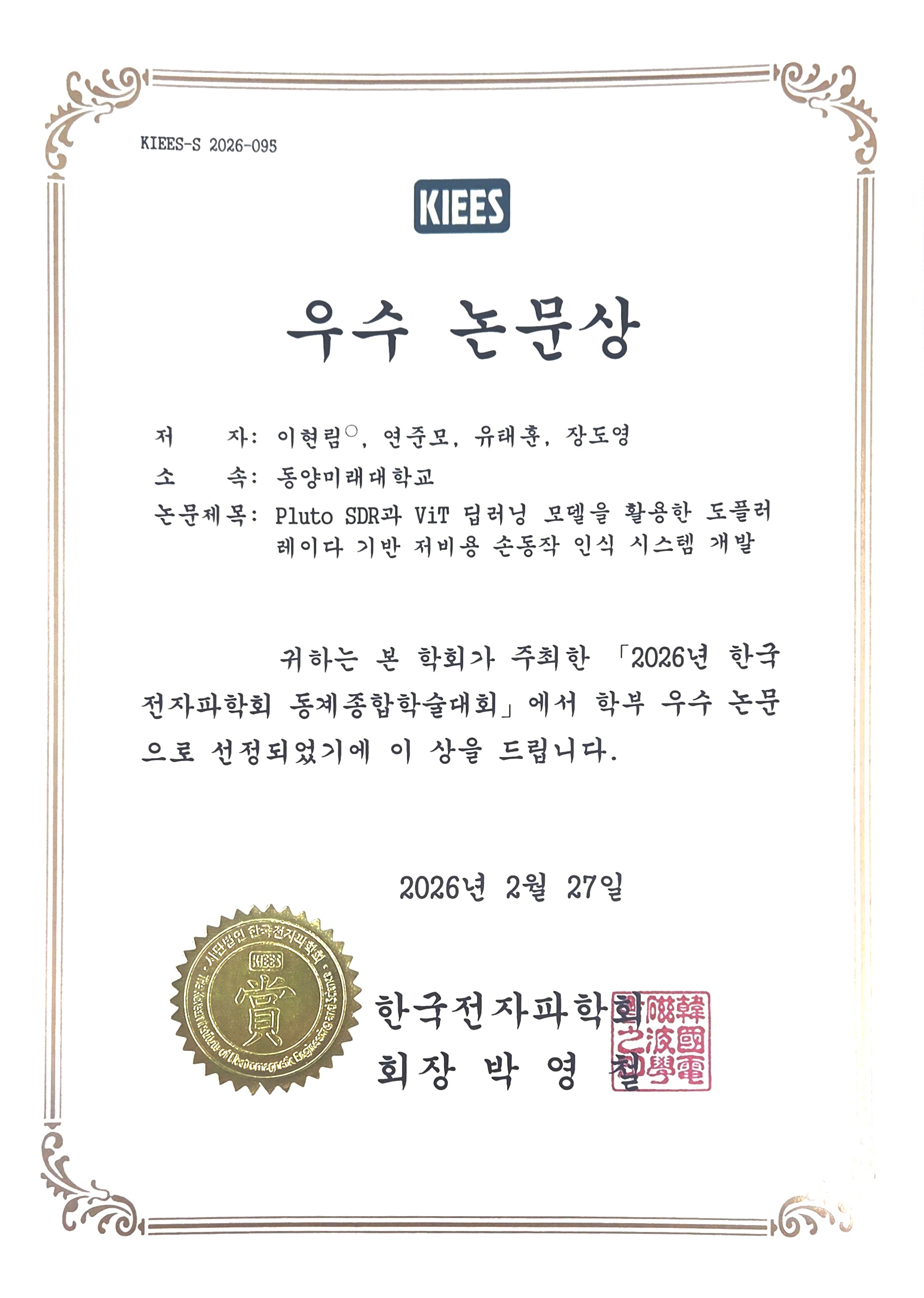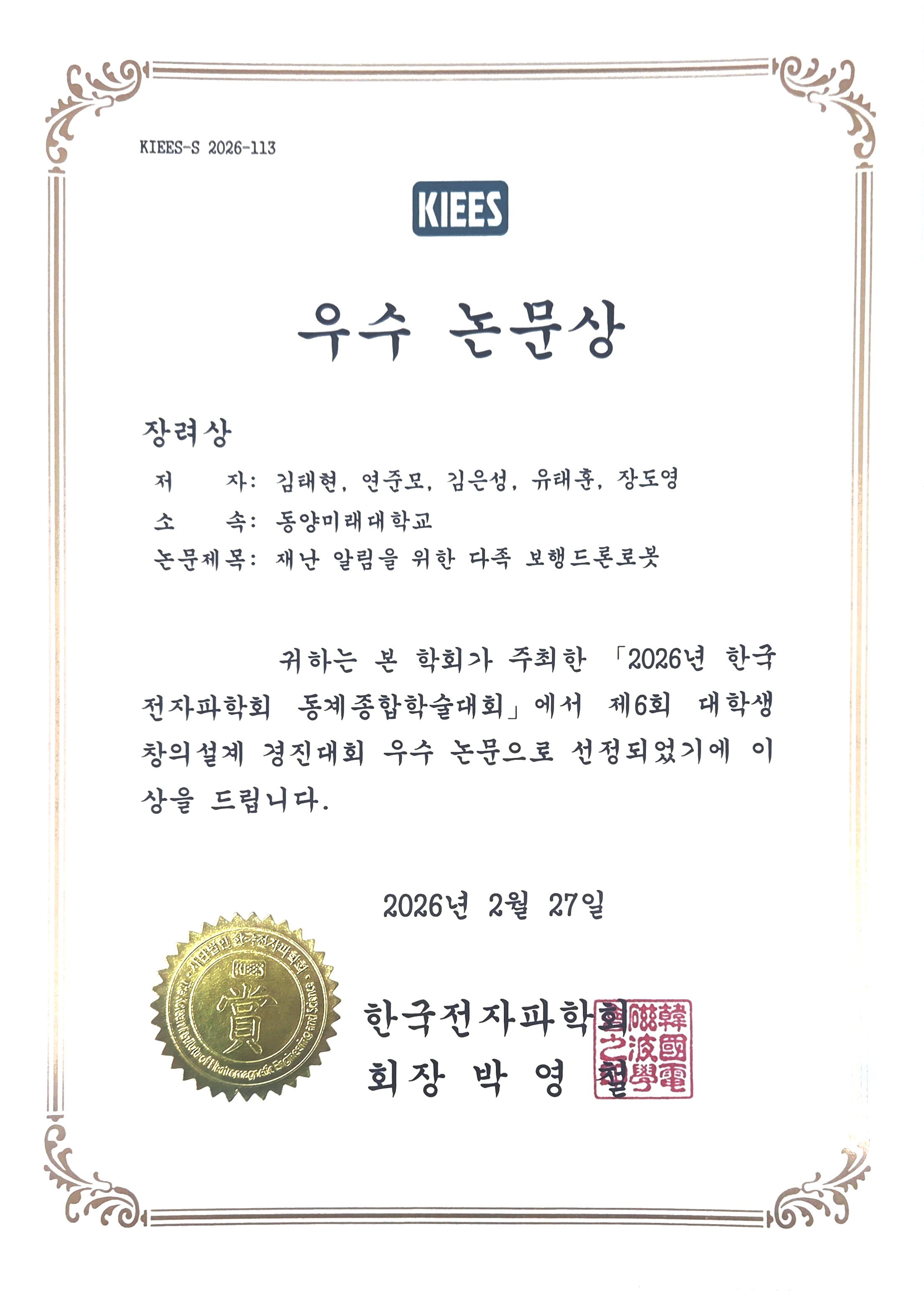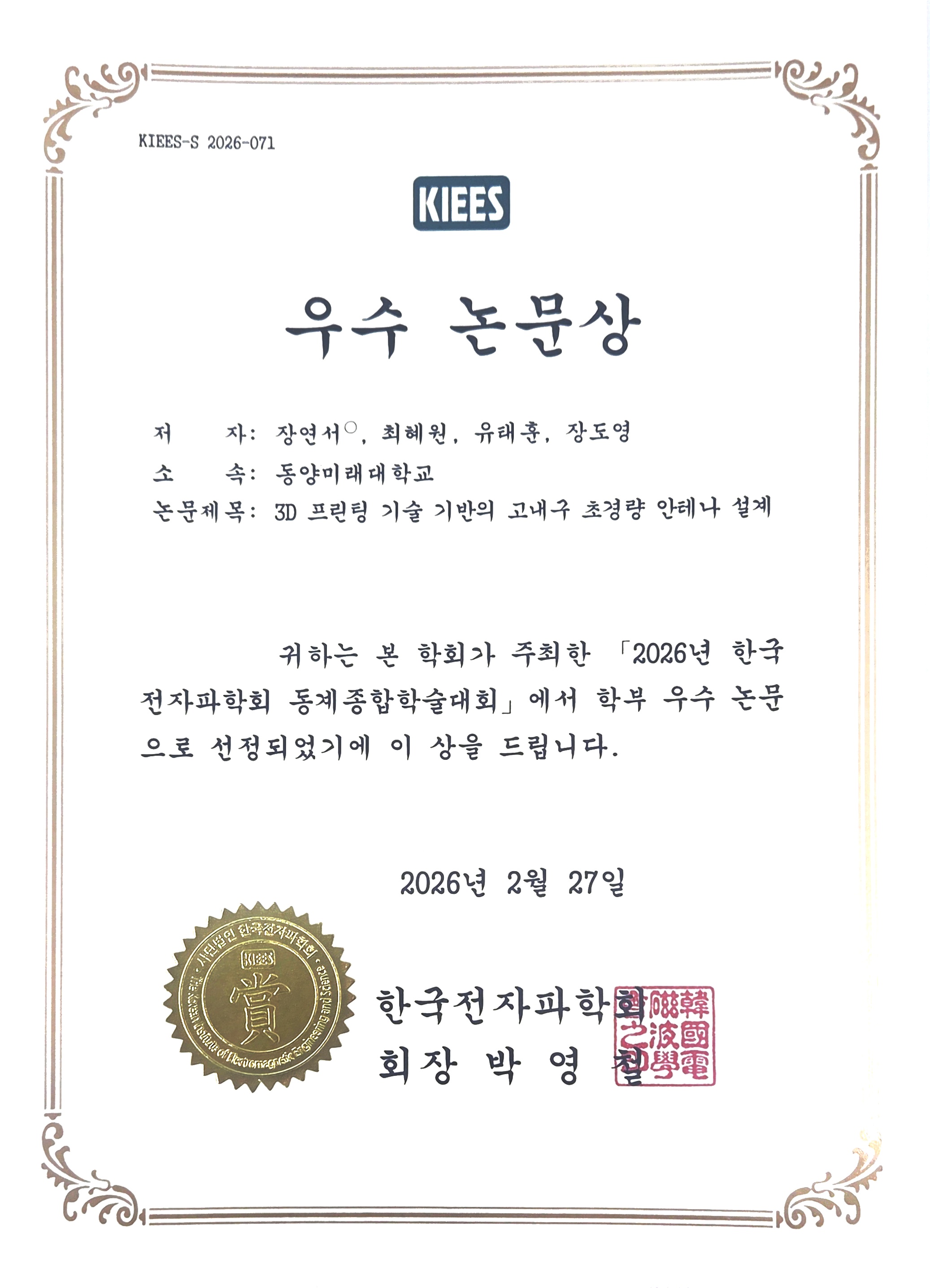 2026년 2월 25일(수)~28일(토). ICC JEJU(제주국제컨벤션센터)에서 열린 『한국전자파학회 2026 동계학술대회』의 ‘학부생 논문 경진대회’ 부문에서 우리대학 전공동아리인 작품연구회(지도교수: 유태훈, 장도영) 소속 학생들이 ‘우수상’을 수상했습니다.