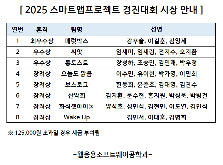 웹응용소프트웨어공학과 학과공지 홈으로 fnctId=combBbs,fnctNo=86 글번호 250054 [웹소] 2025학년도 주문식 교육 스마트앱프로젝트 경진대회 시상 안내 단축URL복사 작성일 2025.12.05 작성자 한** 조회수 408 첨부파일 첨부파일이(가) 없습니다.