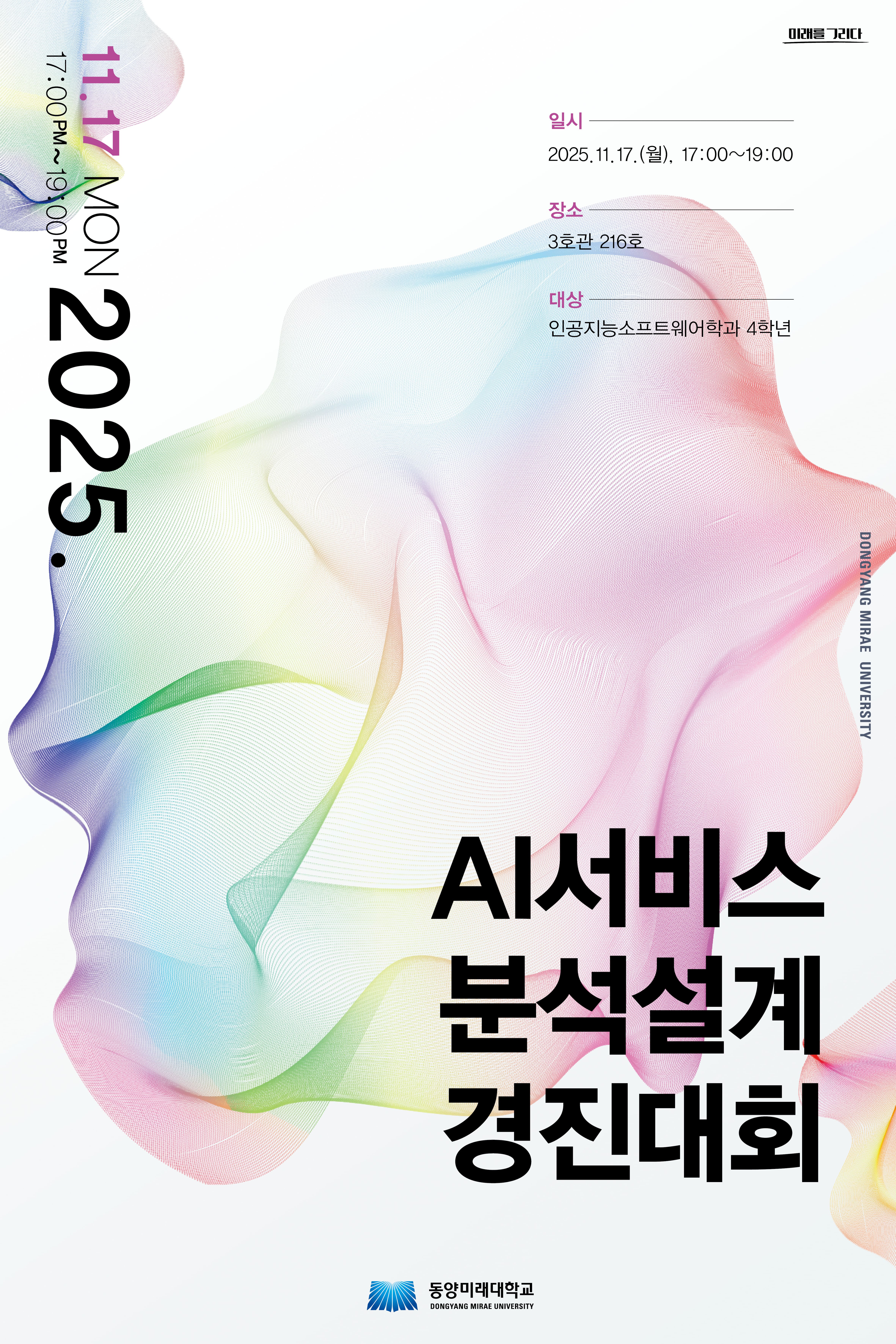 인공지능소프트웨어학과 학과공지 홈으로 fnctId=combBbs,fnctNo=82 글번호 249836 [인공] 2025 AI서비스 분석 설계 경진대회 안내_11/17(월) 단축URL복사 작성일 2025.11.05 작성자 배** 조회수 89 첨부파일 인소 AI서비스 분석 설계 경진대회 포스터.jpg