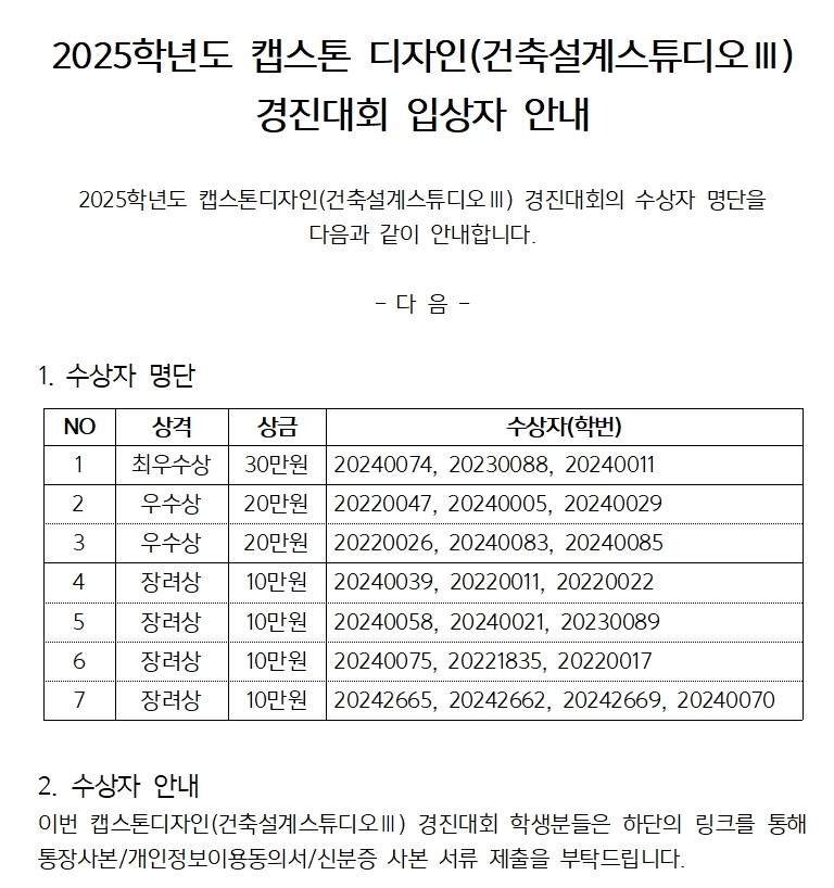 건축과 학과공지 홈으로 fnctId=combBbs,fnctNo=76 글번호 250147 [건축] 2025학년도 건축설계스튜디오Ⅲ 경진대회 입상자 안내 단축URL복사 작성일 2025.12.24 작성자 이** 조회수 347 첨부파일 첨부파일이(가) 없습니다. 링크: https://forms.gle/Ak8yyejn9ZCtB8ZYA 기한 내 미제출시, 수상자 추천에서 제외함.